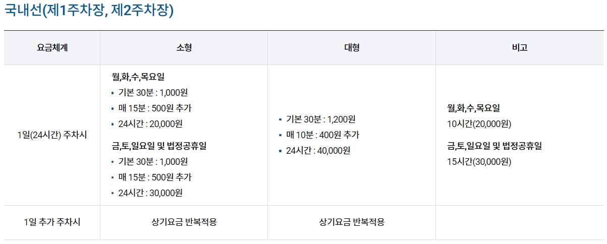 김포공항 국내선 주차장 요금은 아래와 같습니다. 제 1주차장과 제2주차장 주차장 요금은 동일한 것을 확인해볼 수 있습니다. 다만 제 1주차장은 예약이 불가하며 제 2주차장만 예약 주차할 수 있다는 점 참고하시기 바랍니다.